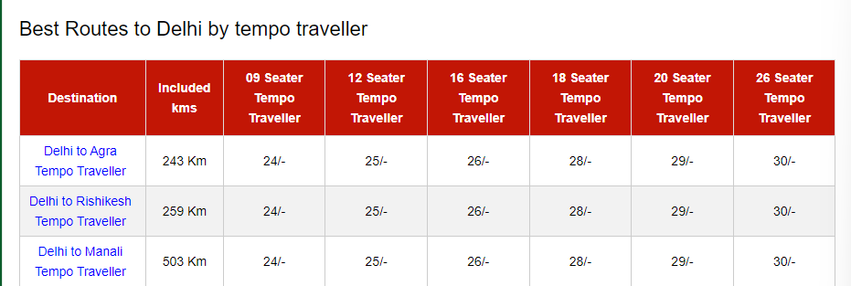 | 26 Seater Tempo Traveller fare from Delhi to Manali (26+1) | 503 km | Rs. 30/km | Rs. 30/km |